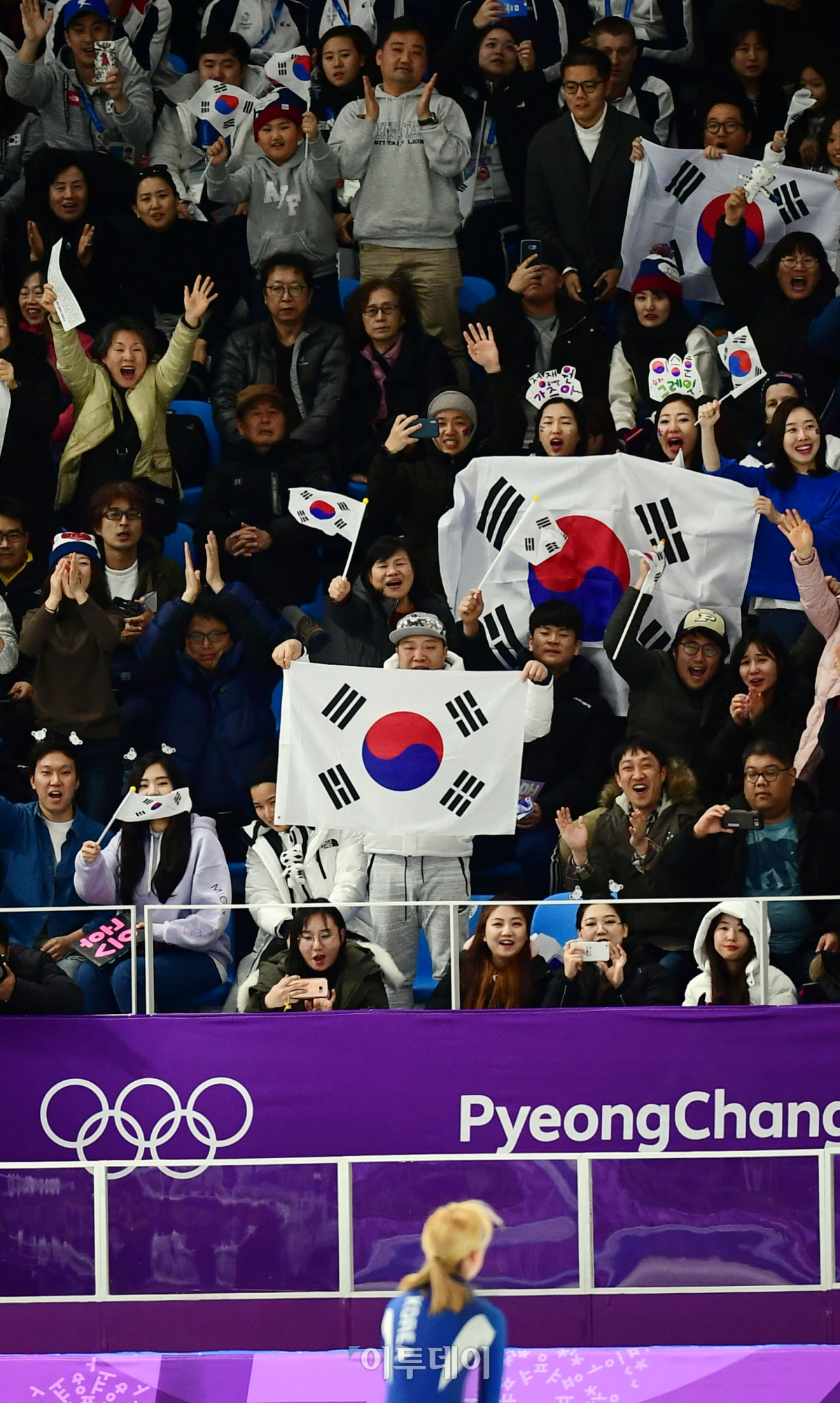 24일 강원도 강릉스피드스케이팅 경기장에서 열린 2018 평창동계올림픽 스피드스케이팅 여자 매스스타트 결승에서 관중들이 은메달을 획득한 김보름을 향해 환호하고 있다. 이동근 기자 foto@