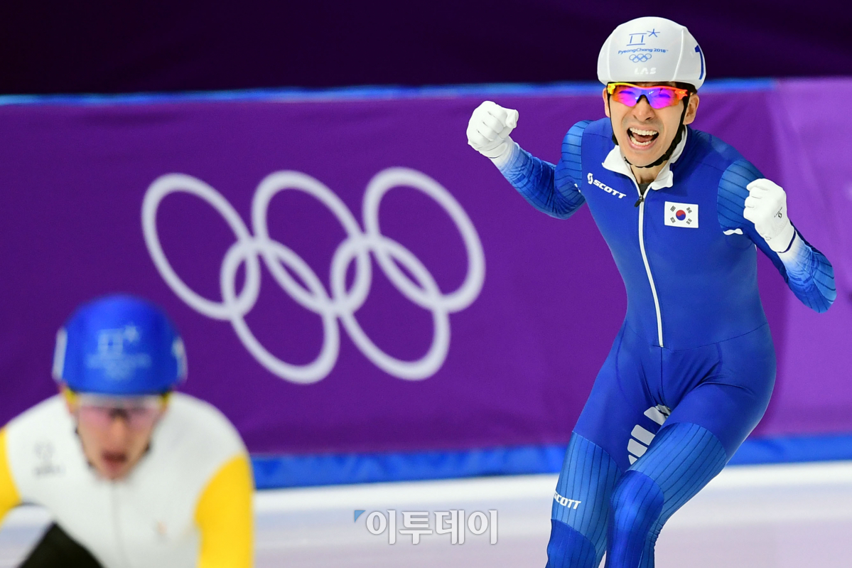 24일 강원도 강릉스피드스케이팅 경기장에서 열린 2018 평창동계올림픽 스피드스케이팅 남자 매스스타트 결승에서 금메달을 거머쥔 이승훈이 포효하고 있다. 이동근 기자 foto@