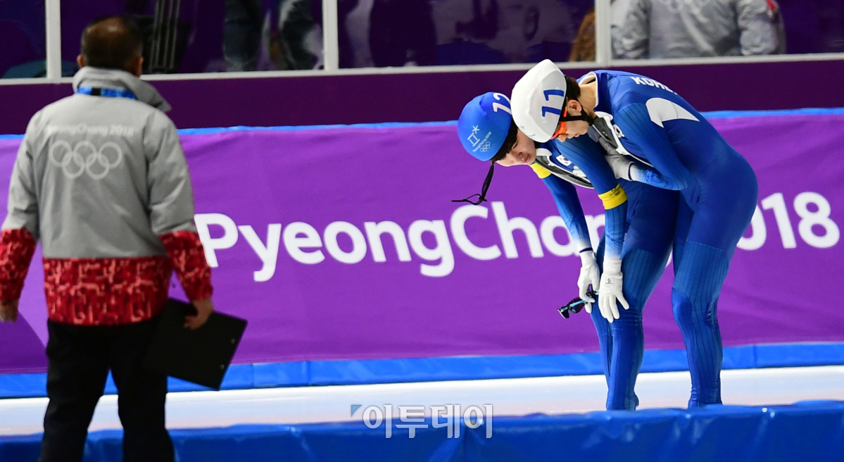 24일 강원도 강릉스피드스케이팅 경기장에서 열린 2018 평창동계올림픽 스피드스케이팅 남자 매스스타트 결승에서 금메달을 거머쥔 이승훈(오른쪽)이 정재원과 트랙을 돌며 대화하고 있다. 이동근 기자 foto@