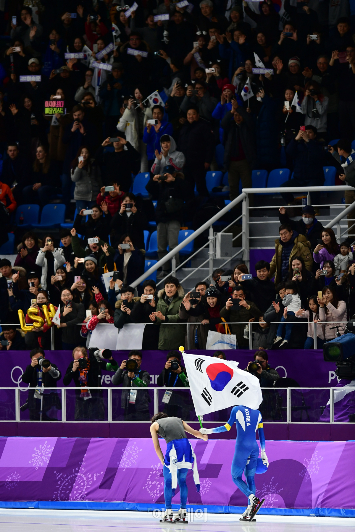 24일 강원도 강릉스피드스케이팅 경기장에서 열린 2018 평창동계올림픽 스피드스케이팅 남자 매스스타트 결승에서 금메달을 거머쥔 이승훈(왼쪽)과 8위를 차지한 정재원이 태극기를 휘날리며 트랙을 돌고 있다. 이동근 기자 foto@