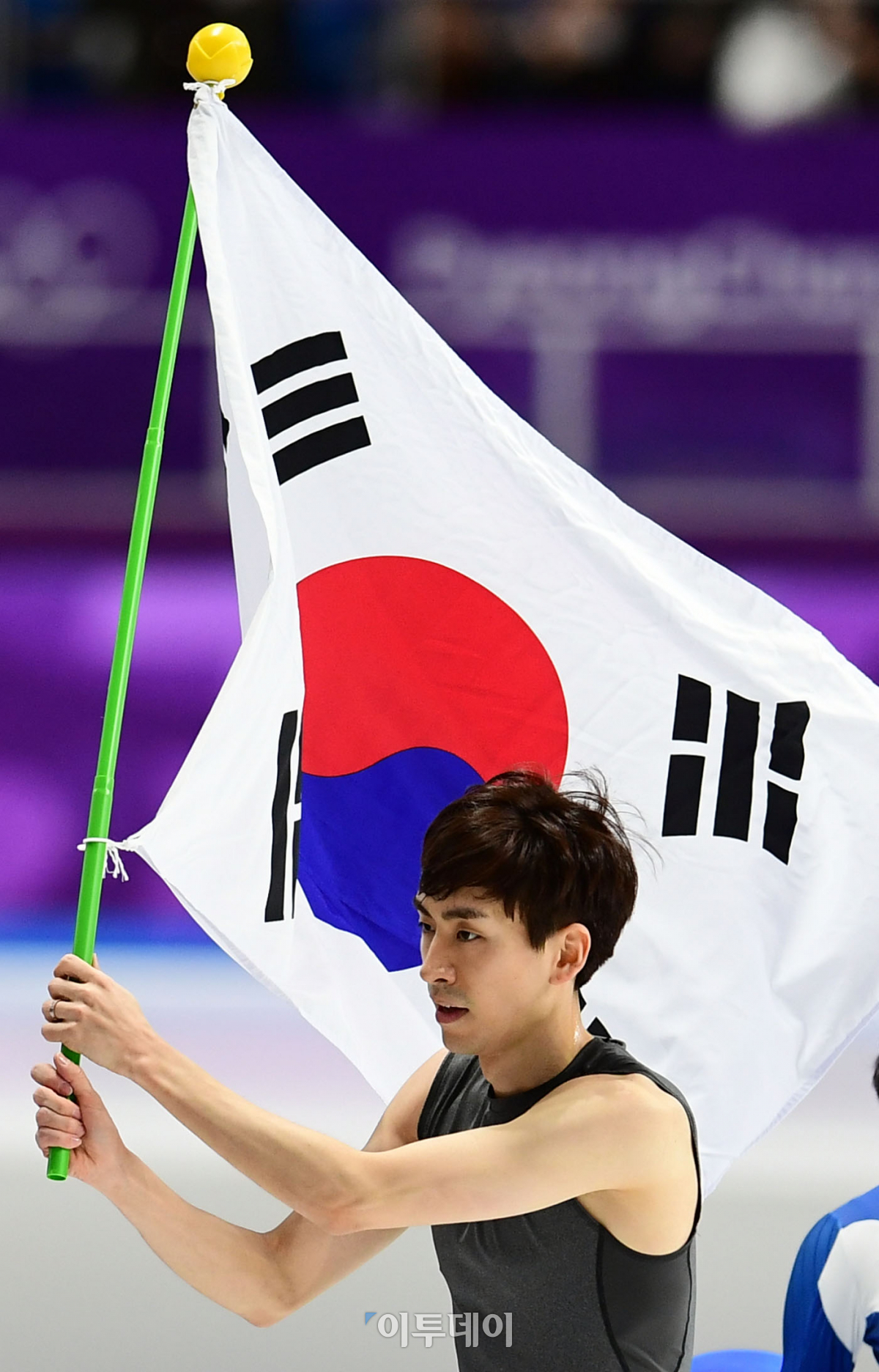 24일 강원도 강릉스피드스케이팅 경기장에서 열린 2018 평창동계올림픽 스피드스케이팅 남자 매스스타트 결승에서 금메달을 거머쥔 이승훈이 태극기를 휘날리고 있다. 이동근 기자 foto@