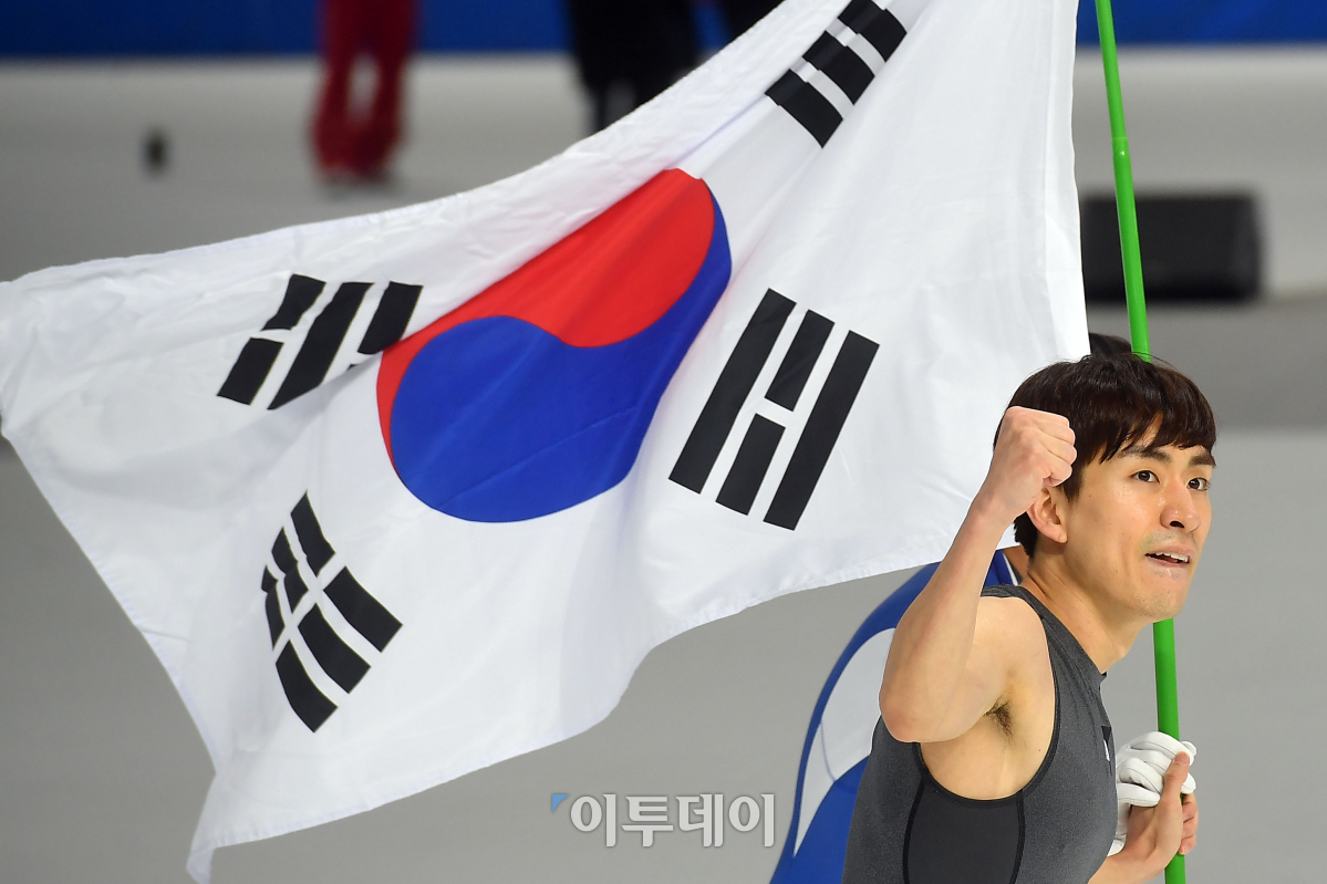 24일 강원도 강릉스피드스케이팅 경기장에서 열린 2018 평창동계올림픽 스피드스케이팅 남자 매스스타트 결승에서 금메달을 거머쥔 이승훈이 관중을 향해 인사하고 있다. 이동근 기자 foto@