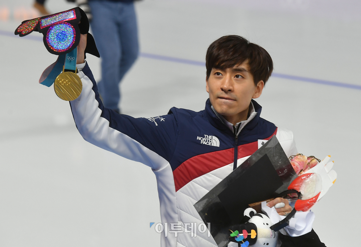 24일 강원도 강릉스피드스케이팅 경기장에서 열린 2018 평창동계올림픽 스피드스케이팅 남자 매스스타트 결승에서 금메달을 거머쥔 이승훈이 관중을 향해 인사하고 있다. 이동근 기자 foto@