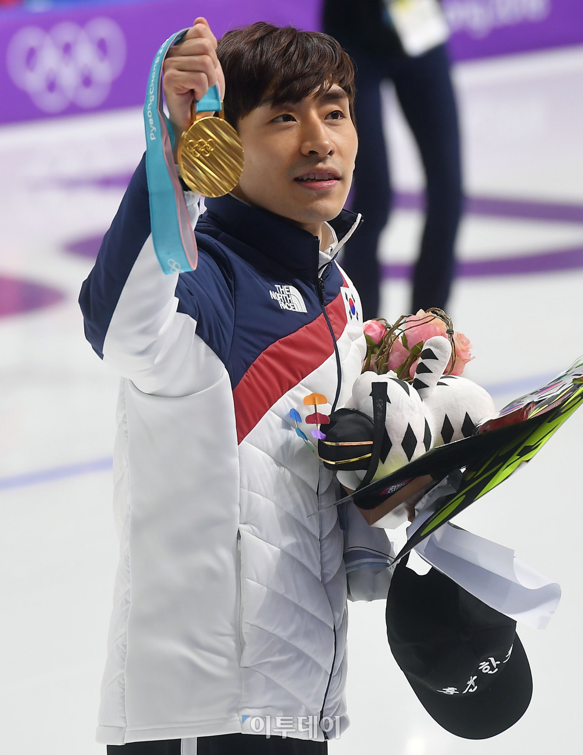 24일 강원도 강릉스피드스케이팅 경기장에서 열린 2018 평창동계올림픽 스피드스케이팅 남자 매스스타트 결승에서 금메달을 거머쥔 이승훈이 관중을 향해 인사하고 있다. 이동근 기자 foto@
