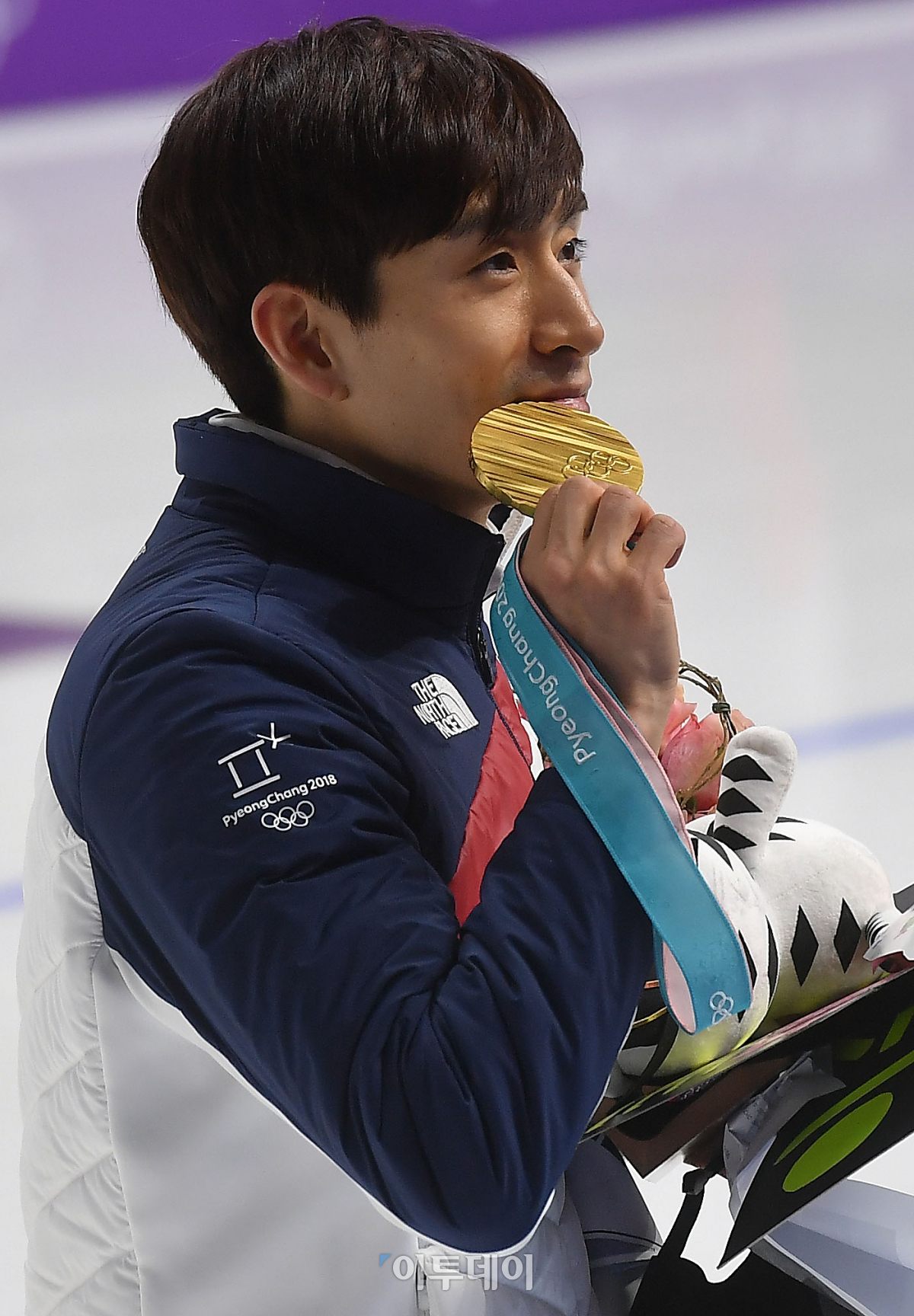 24일 강원도 강릉스피드스케이팅 경기장에서 열린 2018 평창동계올림픽 스피드스케이팅 남자 매스스타트 결승에서 금메달을 거머쥔 이승훈이 메달을 입에 대고 있다. 이동근 기자 foto@