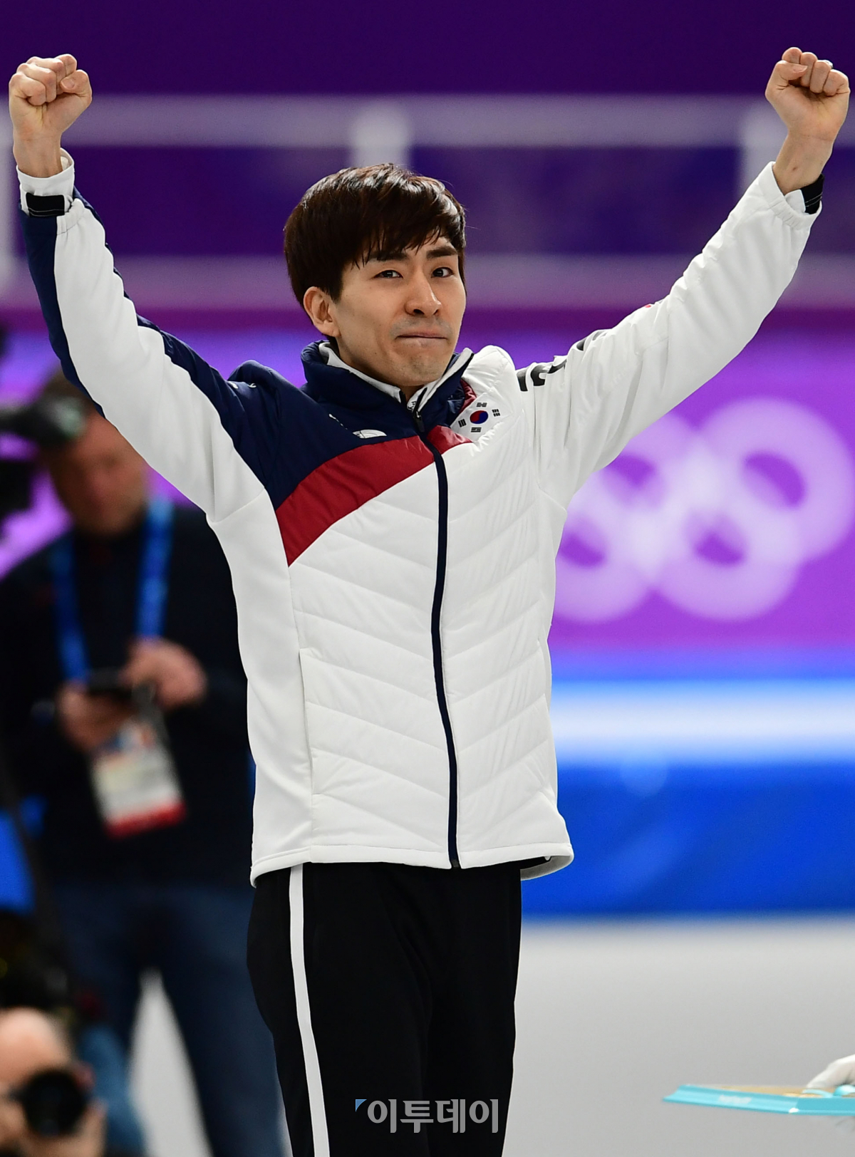 24일 강원도 강릉스피드스케이팅 경기장에서 열린 2018 평창동계올림픽 스피드스케이팅 남자 매스스타트 결승에서 금메달을 거머쥔 이승훈이 시상대에서 두 팔을 번쩍 들어보이고 있다. 이동근 기자 foto@
