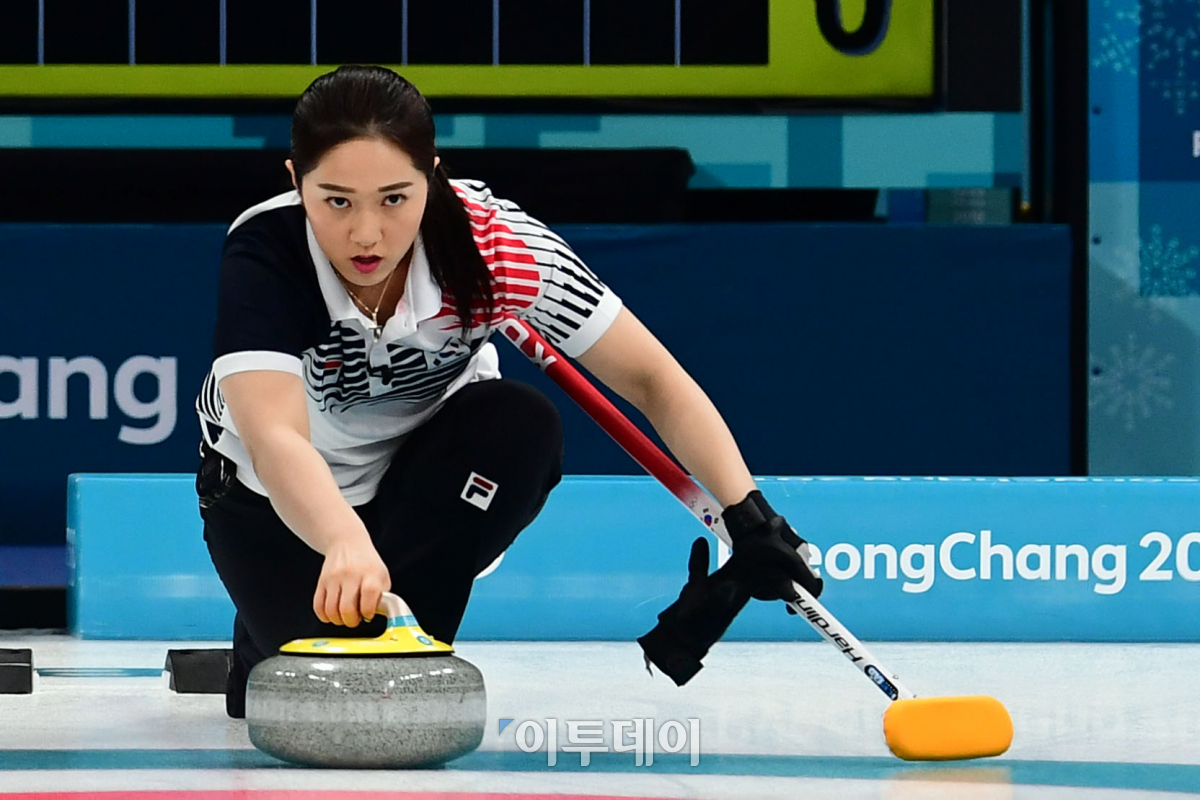 2018평창동계올림픽 여자 컬링 결승 대한민국(김은정, 김영미, 김경애, 김선영, 김초희)과 스웨덴의 경기가 25일 강원도 강릉컬링센터에서 열렸다. 써드 김경애가 신중히 스톤을 딜리버리하고 있다. 이동근 기자 foto@