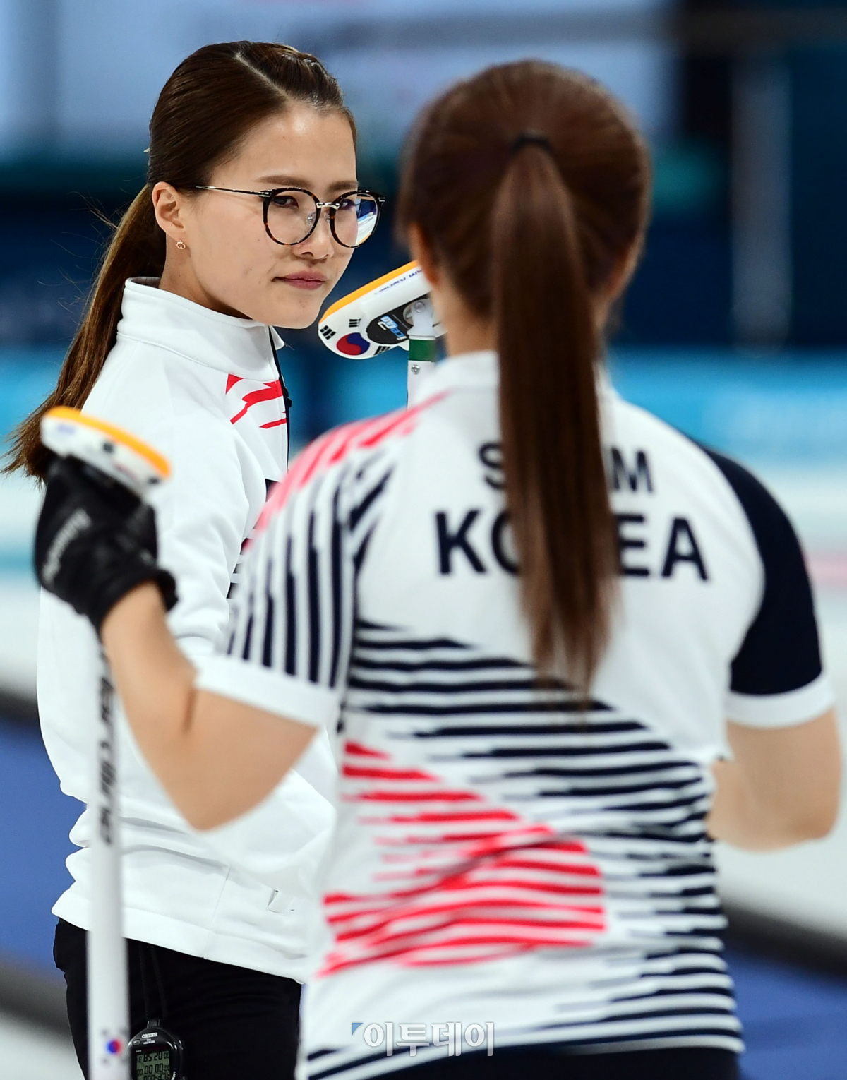 2018평창동계올림픽 여자 컬링 결승 대한민국(김은정, 김영미, 김경애, 김선영, 김초희)과 스웨덴의 경기가 25일 강원도 강릉컬링센터에서 열렸다. 스킵 김은정이 김선영과 하이파이브를 하고 있다. 이동근 기자 foto@