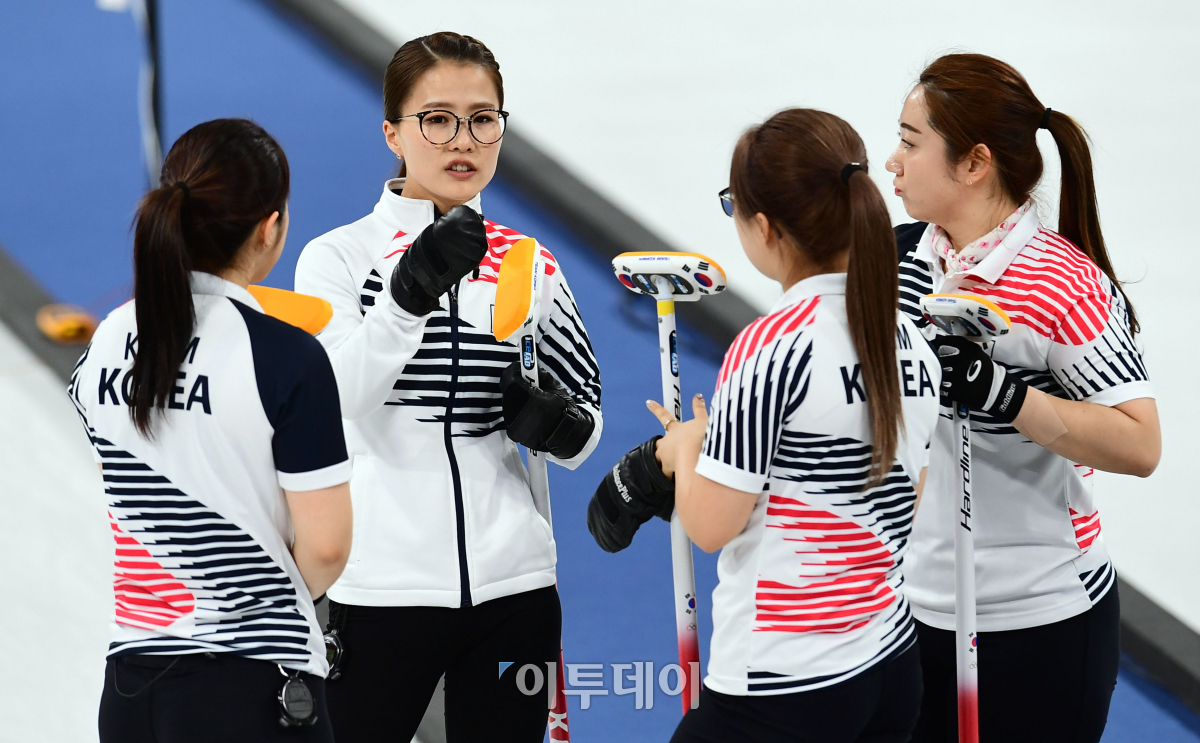 2018평창동계올림픽 여자 컬링 결승 대한민국(김은정, 김영미, 김경애, 김선영, 김초희)과 스웨덴의 경기가 25일 강원도 강릉컬링센터에서 열렸다. 한국선수들이 작전을 짜고 있다. 이동근 기자 foto@