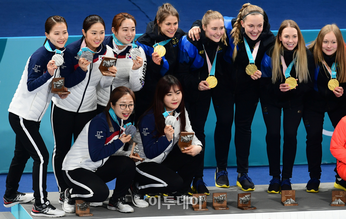 2018평창동계올림픽 여자 컬링 시상식이 25일 강원도 강릉컬링센터에서 열렸다. 은메달을 거머쥔 대한민국 선수들과 금메달을 차지한 스웨덴 선수들이 시상대 위에서 기념촬영을 하고 있다. 이동근 기자 foto@