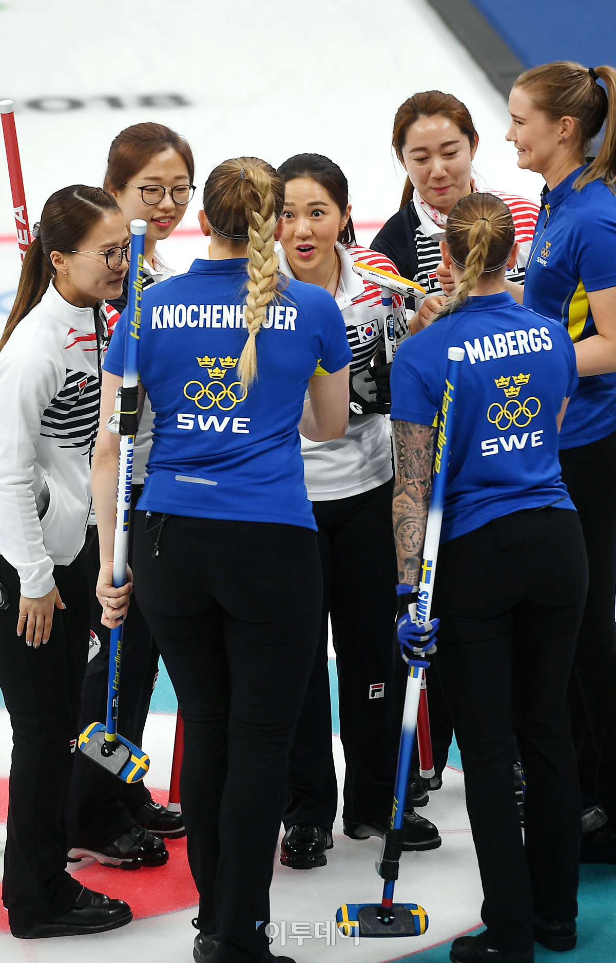 2018평창동계올림픽 여자 컬링 결승 대한민국(김은정, 김영미, 김경애, 김선영, 김초희)과 스웨덴의 경기가 25일 강원도 강릉컬링센터에서 열렸다. 3대 8로 아쉽게 패한 후 대한민국 선수들이 스웨덴 선수들에게 축하의 악수를 청하고 있다. 이동근 기자 foto@