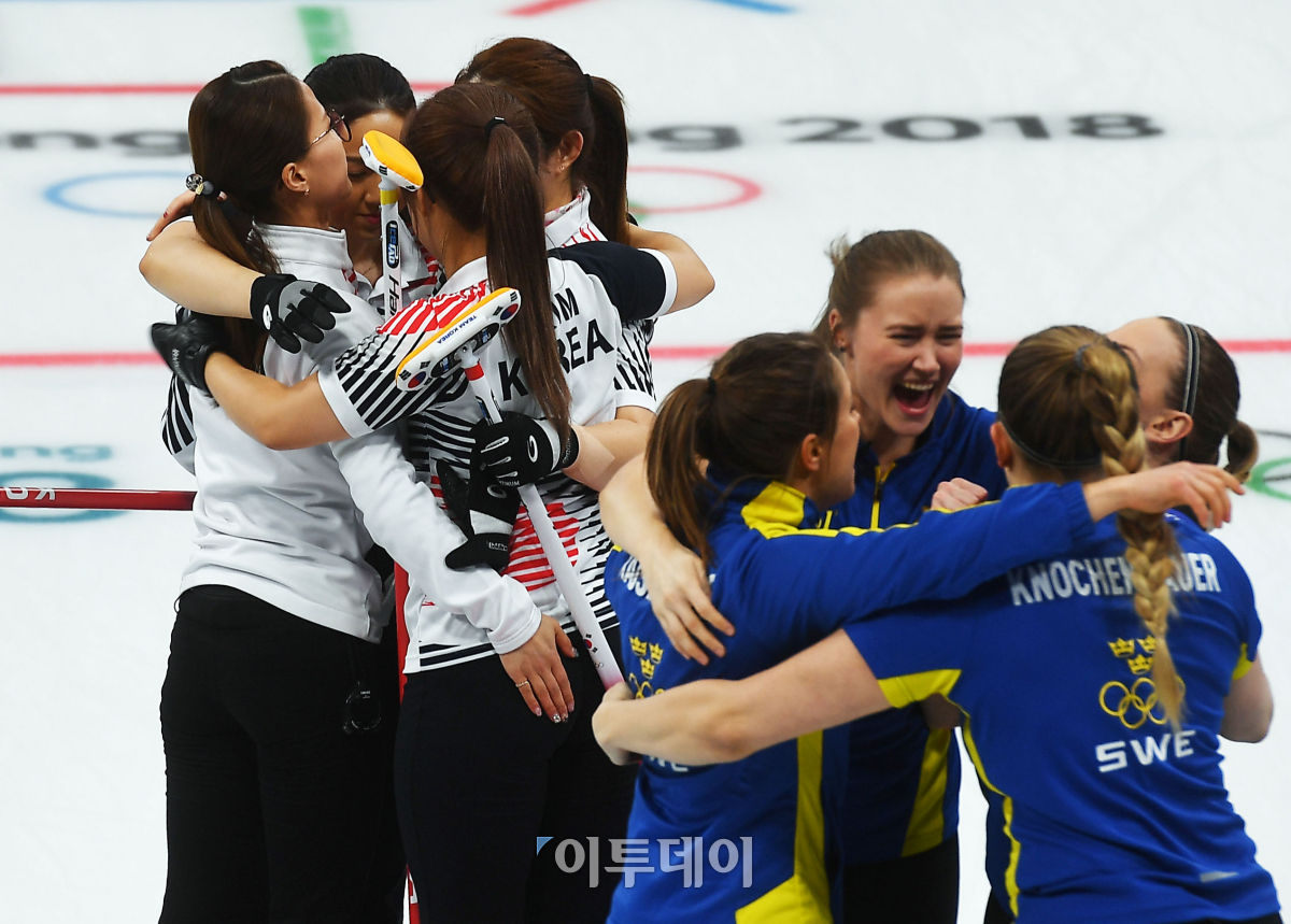 2018평창동계올림픽 여자 컬링 결승 대한민국(김은정, 김영미, 김경애, 김선영, 김초희)과 스웨덴의 경기가 25일 강원도 강릉컬링센터에서 열렸다. 3대 8로 아쉽게 패한 후 대한민국 선수들과 금메달을 차지한 스웨덴 선수들이 서로 안아주고 있다. 이동근 기자 foto@