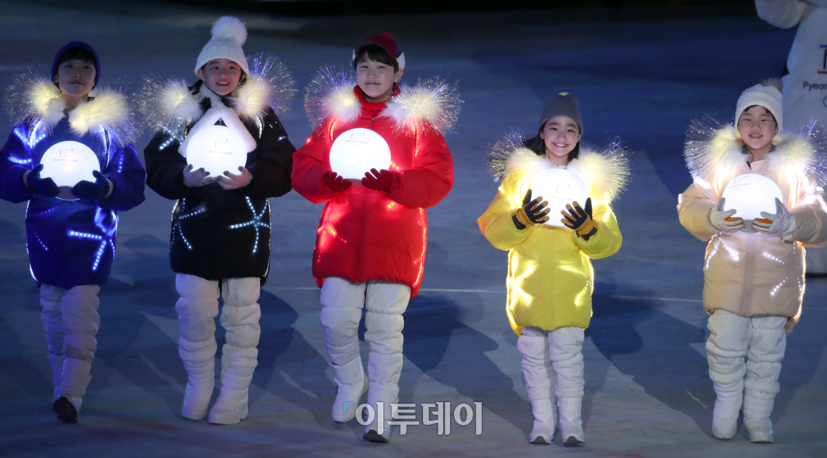 25일 강원도 평창 올림픽스타디움에서 열린 2018평창동계올림픽 폐회식에서 성화 소화 ‘눈꽃의 인사’가 펼쳐지고 있다. 이동근 기자 foto@