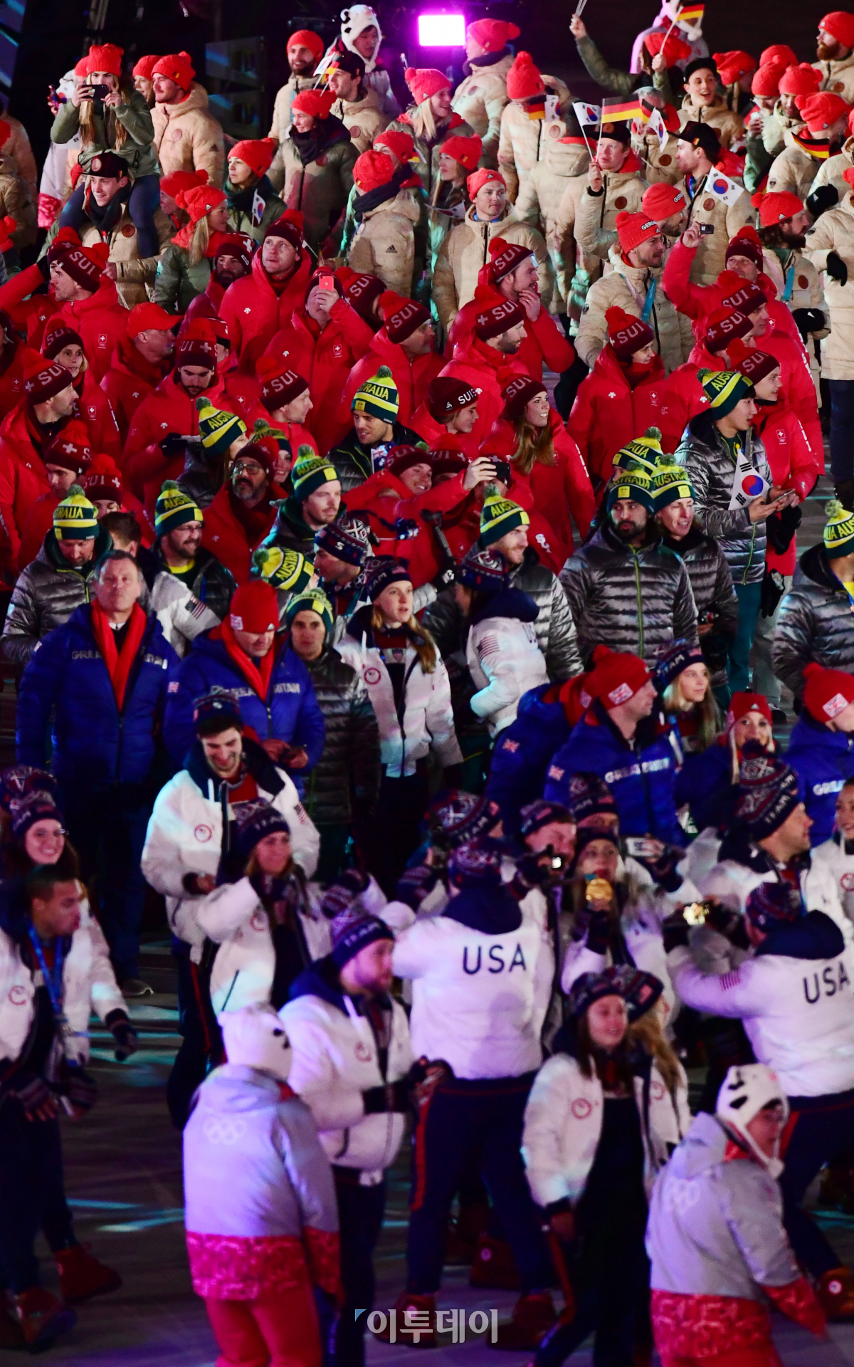 2018평창동계올림픽 폐막식이 25일 강원도 평창올림픽플라자 내 개폐회식장에서 '미래의 물결'을 주제로 열린 가운데 각국 참가 선수들이 입장하고 있다. 이동근 기자 foto@