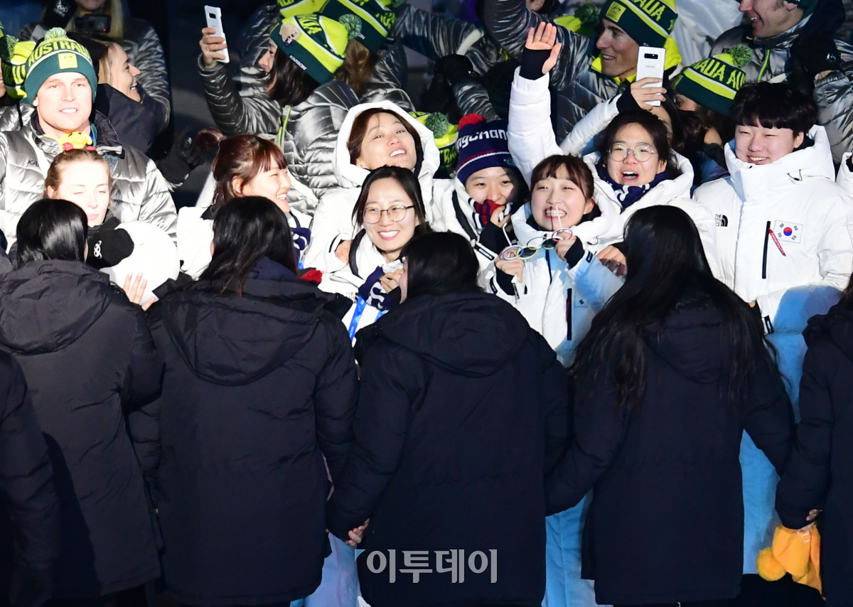 2018평창동계올림픽 폐막식이 25일 강원도 평창올림픽플라자 내 개폐회식장에서 '미래의 물결'을 주제로 열린 가운데 여자아이스하키 남북단일팀 주장 박종아(왼쪽에서 세 번째) 선수를 비롯한 한국 선수단이 '승리의 밤' 공연을 즐기고 있다. 이동근 기자 foto@
