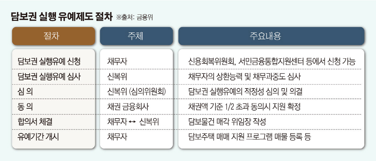 해당 요건을 모두 만족하면 최장 1년간 담보권 실행 유예뿐 아니라 이자율 조정, 연체이자 전액 감면 등 혜택도 받을 수 있다.