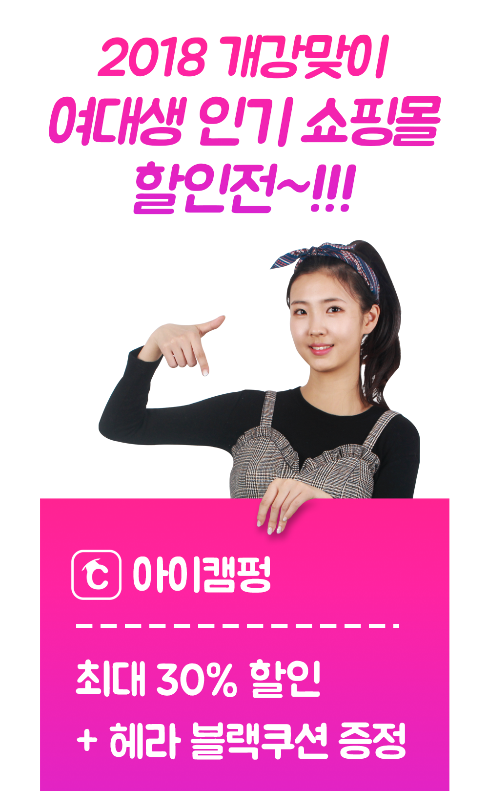 대학생 정보 애플리케이션 ‘아이캠펑’은 새학기를 맞아 학생을 대상으로 한 쇼핑몰 할인전을 개최한다고 26일 밝혔다.