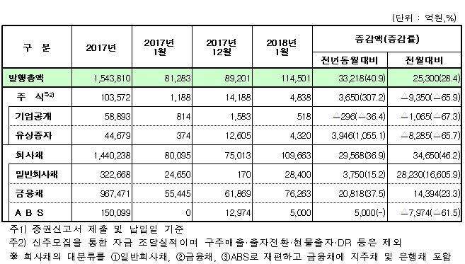 기업들이 1월에 주식과 회사채 발행 등으로 조달한 자금이 전달보다 30% 가까이 늘었다. 증권 발행은 감소했으나 회사채와 기업어음(CP), 전자단기사채 발행 수요가 이를 상쇄했다.