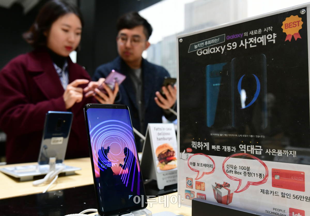갤럭시 S9 사전 예약 판매일인 28일 오전 서울 세종대로 KT스퀘어에서 시민들이 제품을 살펴보고 있다. 사전 예약은 전국 4000여 개의 모바일 특화 체험매장인 S·ZONE을 비롯한 이동통신 3사 매장, 온라인 채널 등에서 다음달 8일까지 할 수 있으며, 16일 국내 공식 출시한다. 가격은 ‘갤럭시 S9(64GB)’이 95만7000원, ‘갤럭시 S9+’(64GB)가 105만6000원, ‘갤럭시 S9+’(256GB) 모델이 115만5000원이다. 이동근 기자 foto@