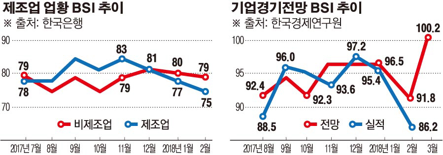 28일 한국은행과 한국경제연구원은 2월 제조업 업황 경기실사지수(BSI)를 각각 75와 86.2로 발표했다. 이는 각각 1년 1개월과 2년 8개월 만에 가장 낮은 수준이다. 설 연휴에 따른 영업일수 감소와 원자재 가격 및 최저임금 등에 따른 인건비 상승 등이 주된 요인이라 게 양 기관의 설명이다.