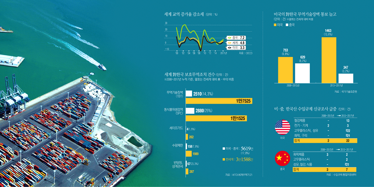 천용찬 현대경제연구원 선임연구원은 “지난 5년(2013~17년)간 미·중의 보호무역 조치는 이전 5년(2008~12년)보다 감소하는 양상을 보이나 반덤핑 등 수입규제가 늘면서 실제 체감하는 보호무역 강도는 더 높아졌다”며 “보호무역에 대응하기 위해 정부와 유관 기관의 지원 강화와 함께 무엇보다 기업 자체의 차별화된 기술 역량이 강하게 요구된다”고 말했다.