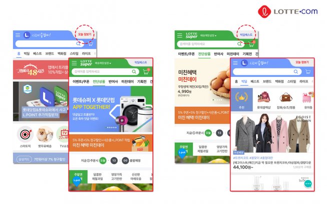 롯데닷컴 앱 접속 시 메인페이지 최상단 우측에 위치한 ‘오늘 장보기’ 날개배너를 누르면 롯데슈퍼 앱이 바로 펼쳐진다. 롯데슈퍼 앱에서도 같은 위치의 ‘빅딜 베스트’ 날개배너를 누르면 롯데닷컴 앱 화면으로 다시 전환된다.