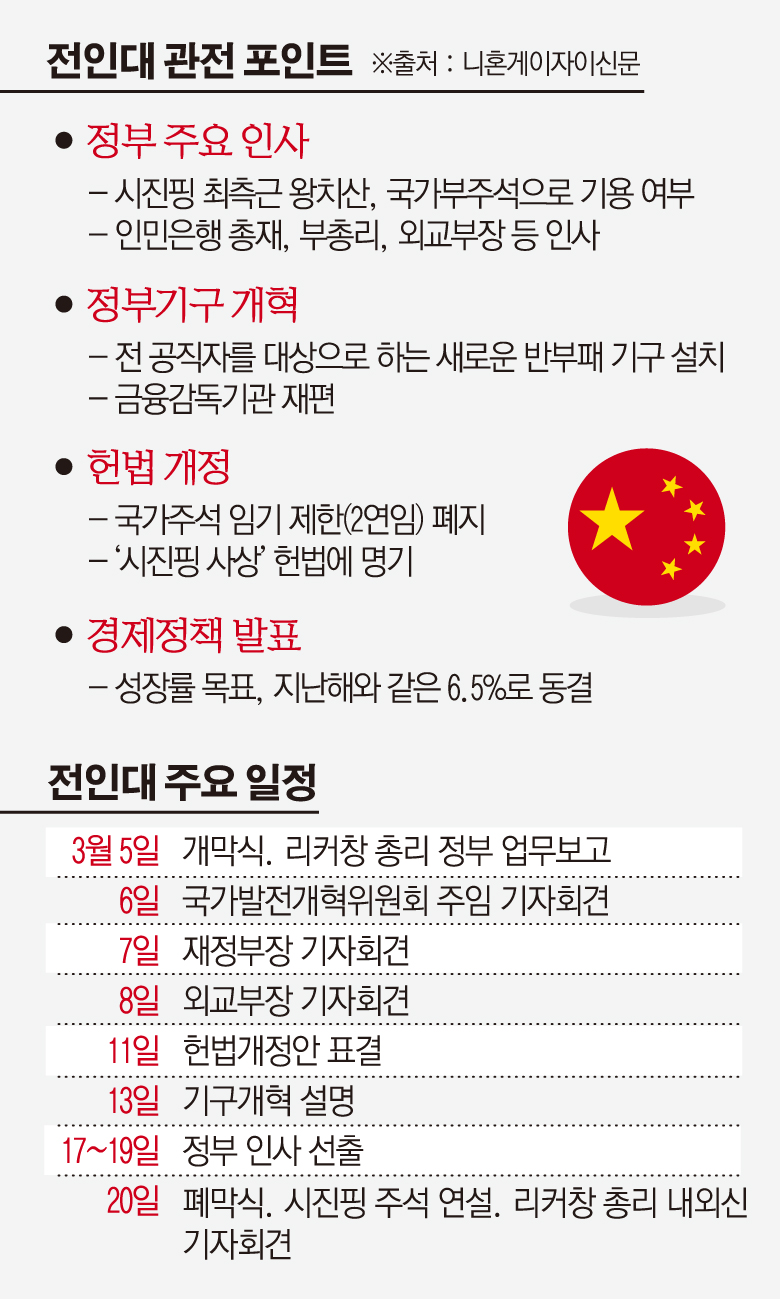 국가주석의 임기 제한을 폐지하는 헌법 개정, 정부와 공산당 내 주요 인사, 새로운 반부패 사령탑 신설을 포함한 대규모 정부 기구 개혁 등 올해 전인대 관전 포인트를 일본 니혼게이자이신문이 소개했다.