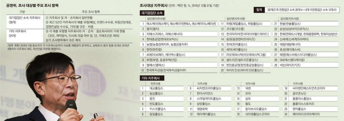 공정위는 지주사가 총수 일가의 사익을 늘리고 지배력을 확대하는 수단으로 악용되고 있다는 지적이 잇따르자 오는 8월까지 지주사 제도 개선안을 마련한다고 밝혔다. 이어 공정위는 최근 지주사의 수익구조를 파악할 수 있는 △지주사 및 자회사, 손자회사 현황 △최근 5년간 지주사의 매출 유형 △지주사와 자회사 간 거래 현황 등의 자료를 제출하라고 주요 지주사에 요청했다. 공정거래법에 따르면 자산총액 5000억 원 이상이면서 이 회사가 소유한 자회사 주식 가격의 합계가 자산총액의 50% 이상이면 지주사다. 이에 따라 그룹 지주사인 SK, LG, GS 등을 포함해 지주사의 요건을 갖춘 삼성바이오로직스, SK이노베이션 등도 조사 대상에 포함됐다.