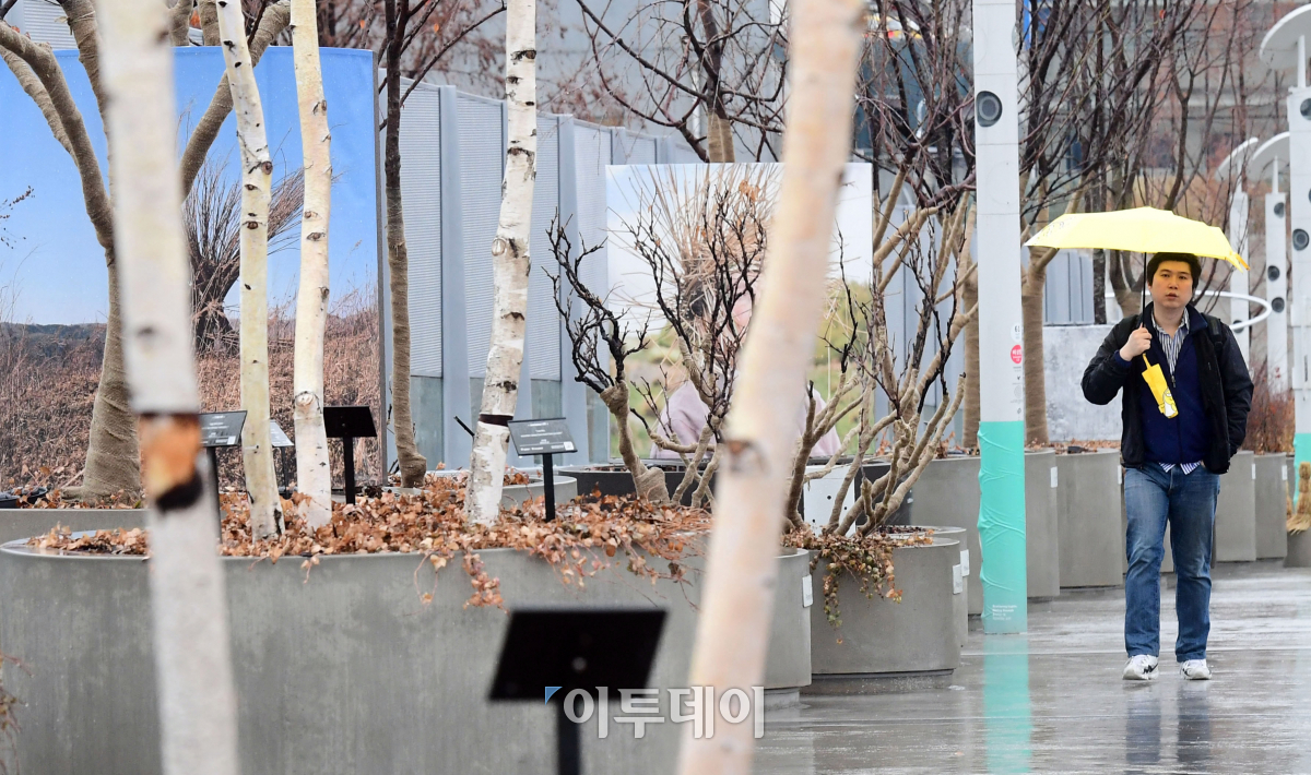 봄비가 내린 5일 오전 서울 중구 서울로7017에서 시민이 우산을 쓴 채 발걸음을 재촉하고 있다. 기상청은 남해안을 지나는 저기압의 영향으로 전국에 비가 내리다 낮부터 북서쪽을 시작으로 대부분 그칠 것으로 예보했다. 이동근 기자 foto@