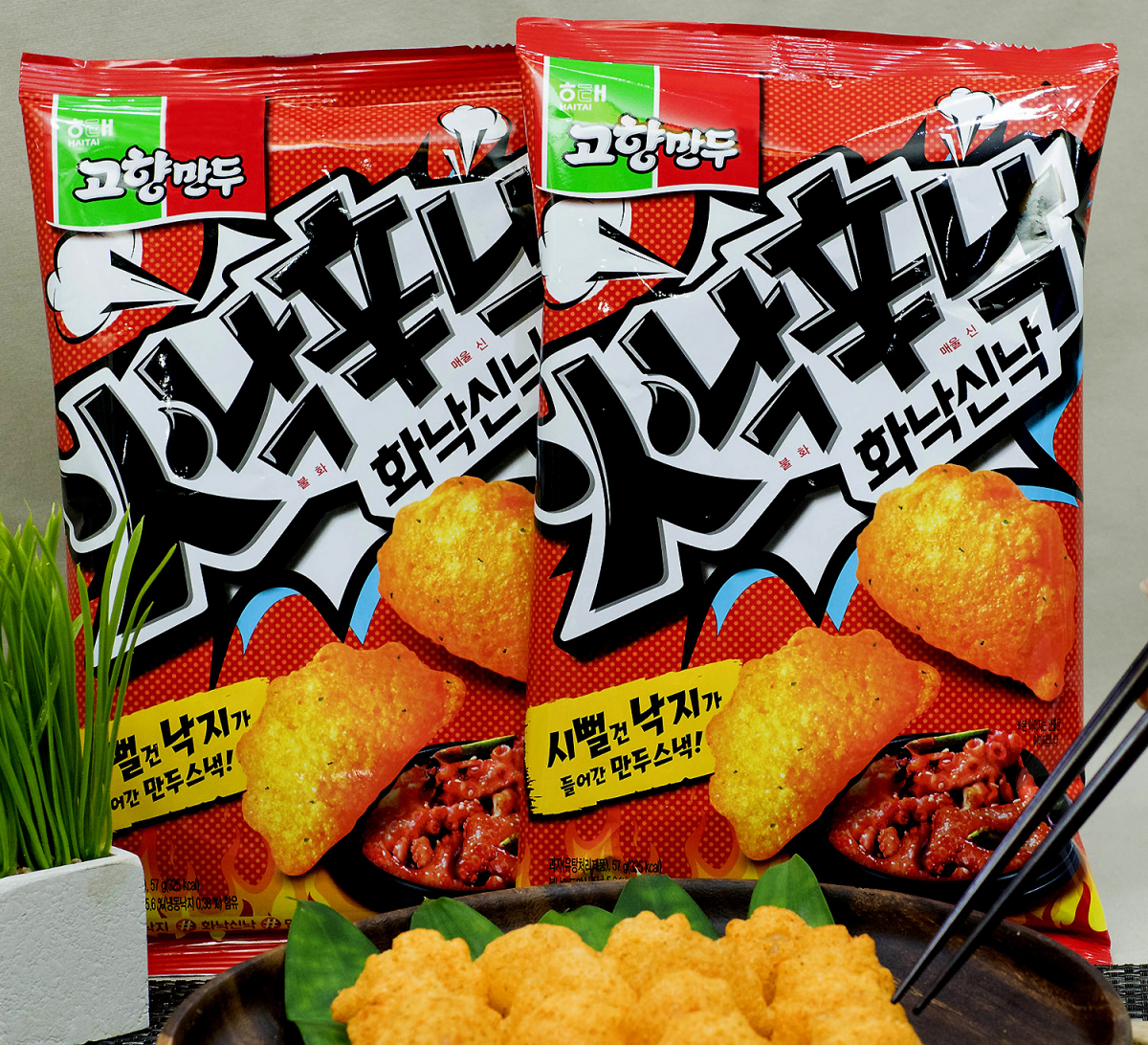 이 제품은 매운 낙지 맛의 '불낙교자'를 재해석한 매콤한 과자로, 초기부터 만두개발팀이 합류해 만두 본연의 특징을 살렸다고 해태제과는 설명했다.