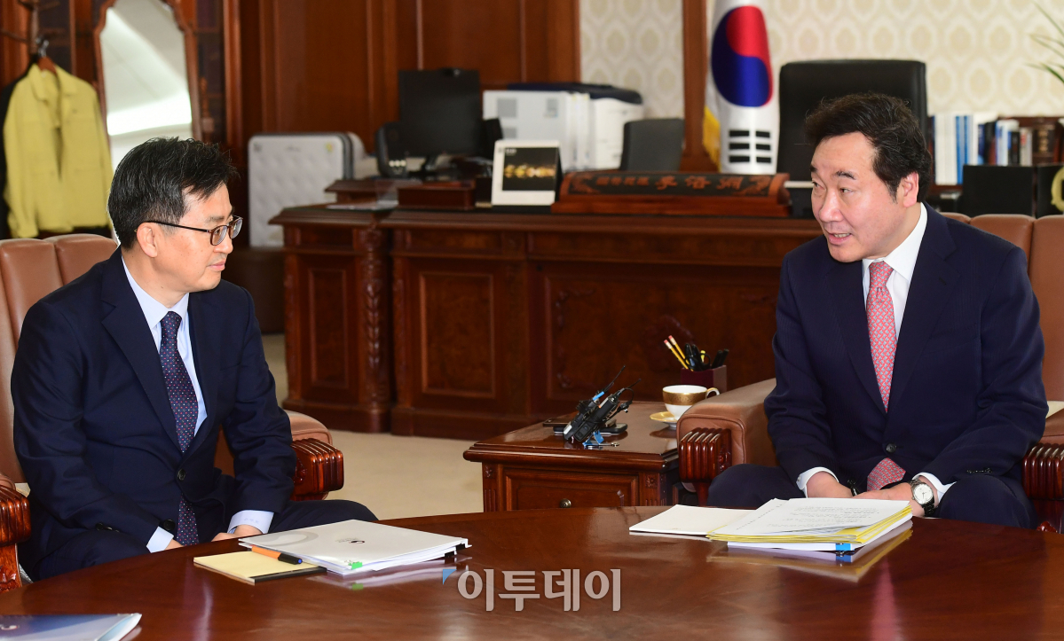 이낙연(오른쪽) 국무총리가 6일 오전 서울 세종로 정부서울청사에서 열린 총리-부총리 협의회에서 모두발언을 하고 있다. 취임 후 처음으로 열리는 이번 협의회는 경제·사회·외교 관련 주요 현안들을 논의하며 월 1회 정기적으로 개최하되 현안이 생길때 마다 수시로 열 예정이다. 이동근 기자 foto@