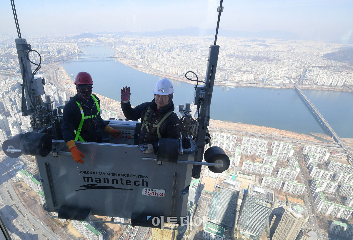 절기상 경칩인 6일 서울 송파구 롯데월드타워에서 청소 전문 인부들이 새봄맞이 유리창 청소를 하며 실내를 향해 손을 흔들고 있다. 약 4만 2천장의 유리로 둘러싸인 롯데월드타워의 외벽청소는 전체 작업이 완료되는 데에만 약 3개월이 걸린다. 이동근 기자 foto@