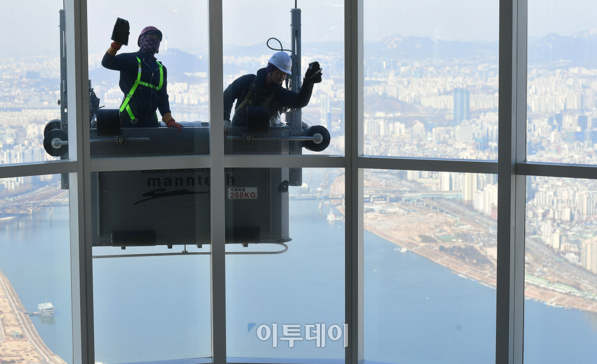 절기상 경칩인 6일 서울 송파구 롯데월드타워에서 청소 전문 인부들이 새봄맞이 유리창 청소를 하고 있다. 약 4만 2천장의 유리로 둘러싸인 롯데월드타워의 외벽청소는 전체 작업이 완료되는 데에만 약 3개월이 걸린다. 이동근 기자 foto@