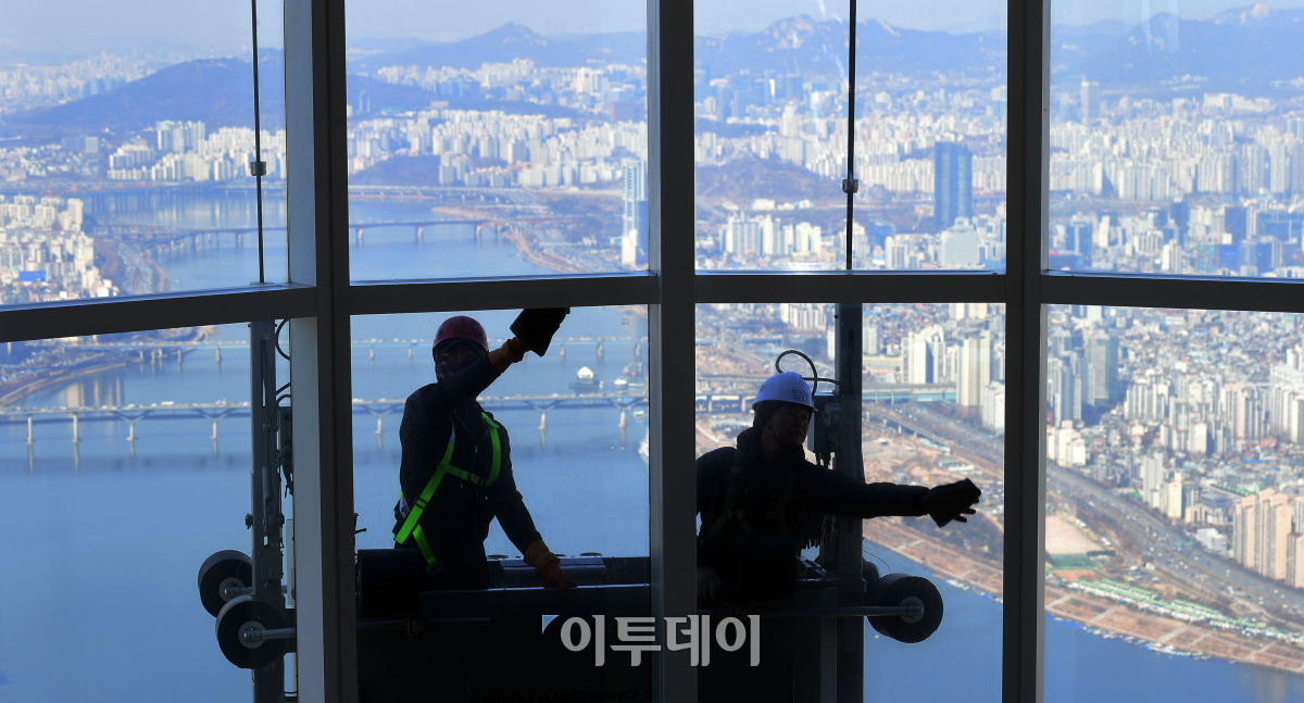 절기상 경칩인 6일 서울 송파구 롯데월드타워에서 청소 전문 인부들이 새봄맞이 유리창 청소를 하고 있다. 약 4만 2천장의 유리로 둘러싸인 롯데월드타워의 외벽청소는 전체 작업이 완료되는 데에만 약 3개월이 걸린다. 이동근 기자 foto@