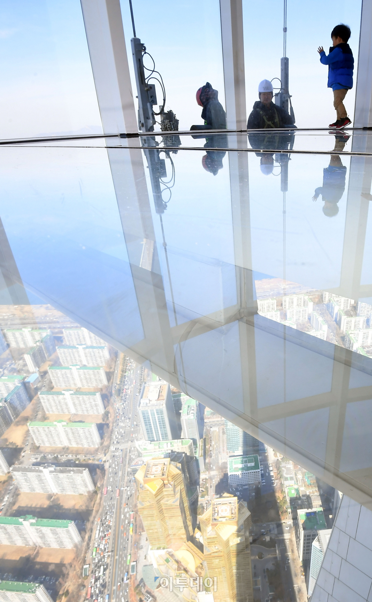롯데월드타워가 6일 새봄맞이 유리창 청소를 실시한 가운데 서울 송파구 서울스카이 전망대를 찾은 한 어린이가 외벽청소인부를 향해 손을 흔들고 있다. 약 4만 2천장의 유리로 둘러싸인 롯데월드타워의 외벽청소는 전체 작업이 완료되는 데에만 약 3개월이 걸린다. 이동근 기자 foto@