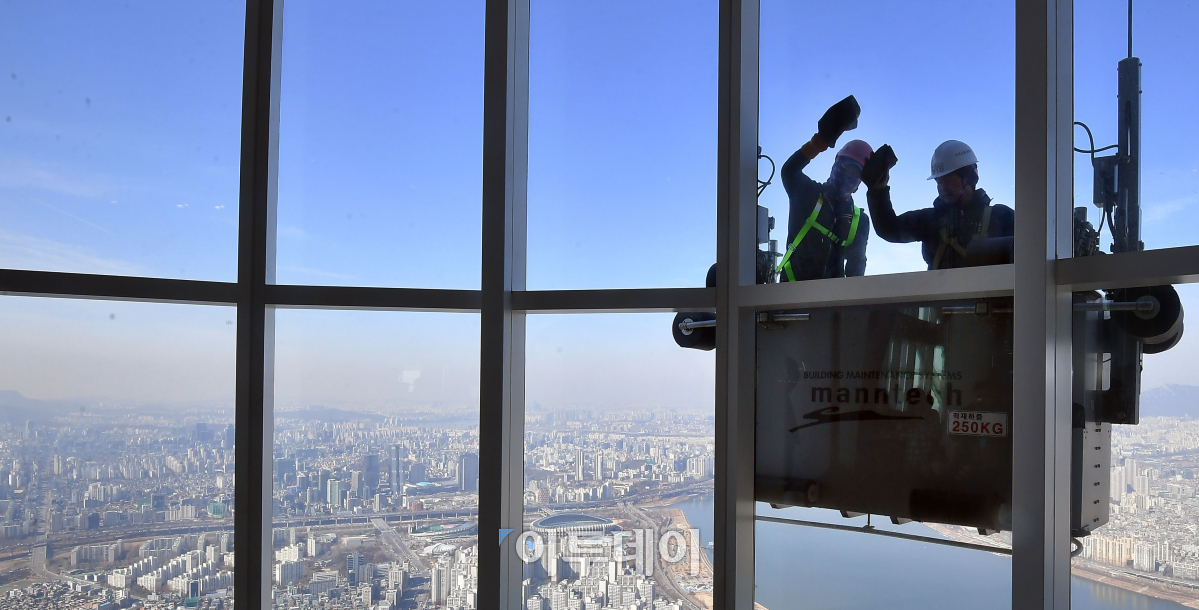 절기상 경칩인 6일 서울 송파구 롯데월드타워에서 청소 전문 인부들이 새봄맞이 유리창 청소를 하고 있다. 약 4만 2천장의 유리로 둘러싸인 롯데월드타워의 외벽청소는 전체 작업이 완료되는 데에만 약 3개월이 걸린다. 이동근 기자 foto@