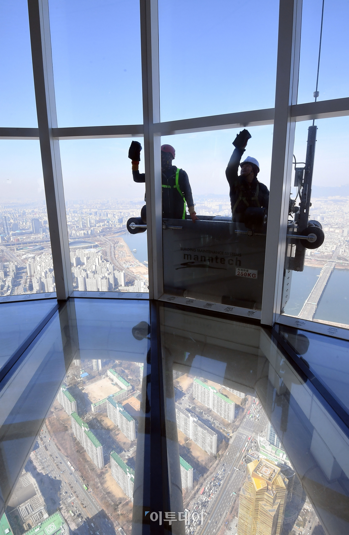 절기상 경칩인 6일 서울 송파구 롯데월드타워에서 청소 전문 인부들이 새봄맞이 유리창 청소를 하고 있다. 약 4만 2천장의 유리로 둘러싸인 롯데월드타워의 외벽청소는 전체 작업이 완료되는 데에만 약 3개월이 걸린다. 이동근 기자 foto@