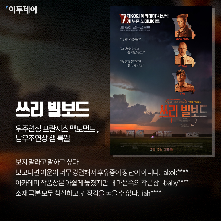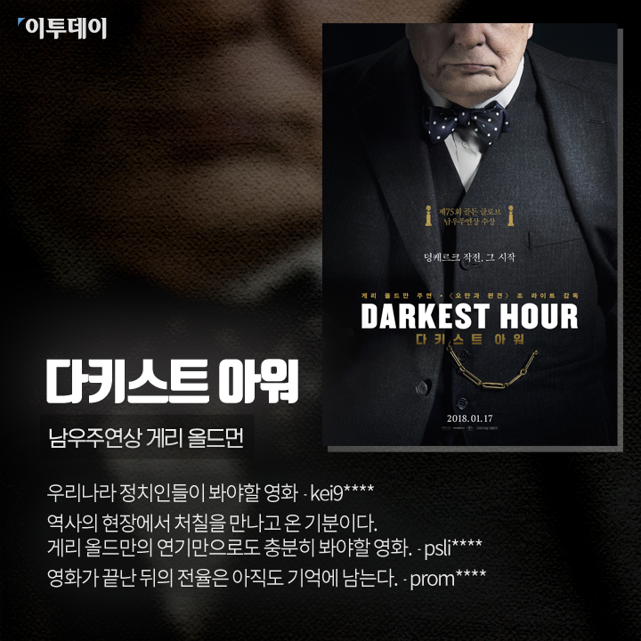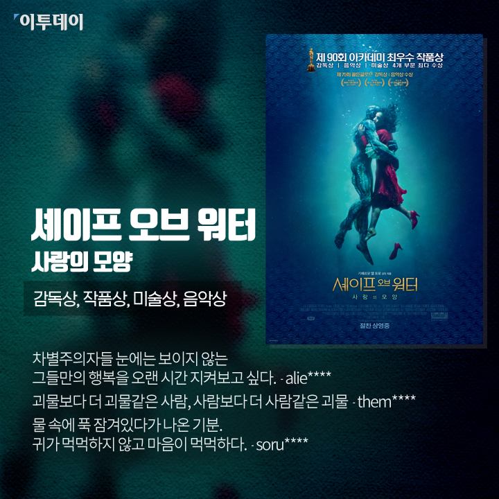 며칠 전 열린 제 90회 아카데미 시상식에 영화팬들의 관심이 집중됐습니다. 올해 아카데미상에서 가장 주목을 받은 작품은 4관왕을 차지한 ‘셰이프 오브 워터:사랑의 모양' 입니다. 작품상과 감독상, 미술상, 음악상 등 4개 부문에서 수상했습니다. 괴생명체와 인간의 사랑을 그린 이색적인 내용도 눈길을 끌었고요. 이 외에도 게리 올드먼에 남우주연상을 안긴 ’다키스트 아워‘, 프랜시스 맥도먼드가 여우주연상을 받은 ’쓰리 빌보드‘가 있습니다. 현재 상영중인 아카데미 수상작들을 소개합니다.