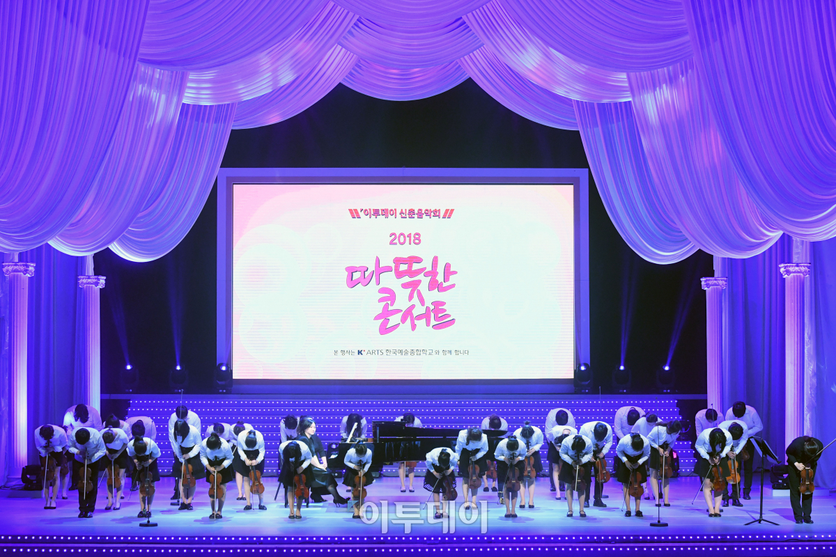 이투데이 신춘음악회 '2018 따뜻한 콘서트'가 9일 서울 여의도 KBS홀에서 열린 가운데 김남윤 바이올린 오케스트라가 공연을 마치고 인사를 하고 있다. 이번 행사는 서현진 아나운서의 진행으로 K‘ARTS 발레단, 김남윤 바이올린 오케스트라, 포르테 디 콰트로, 김범수 등이 함께한다. 고이란 기자 photoeran@