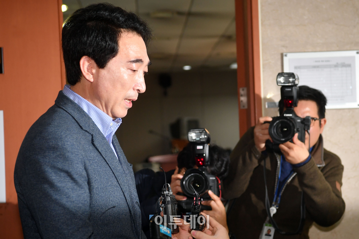 박수현 충남도지사 더불어민주당 예비후보가 11일 서울 여의도 국회 정론관에서 내연녀 공천 의혹 관련 기자회견 후 취재진의 질문에 답하고 있다. 박 예비후보는 '여자 문제' 때문에 이혼했다는 주장과 함께 내연관계에 있던 여성을 지방의원에 공천했다는 의혹을 받고 있다. 이동근 기자 foto@