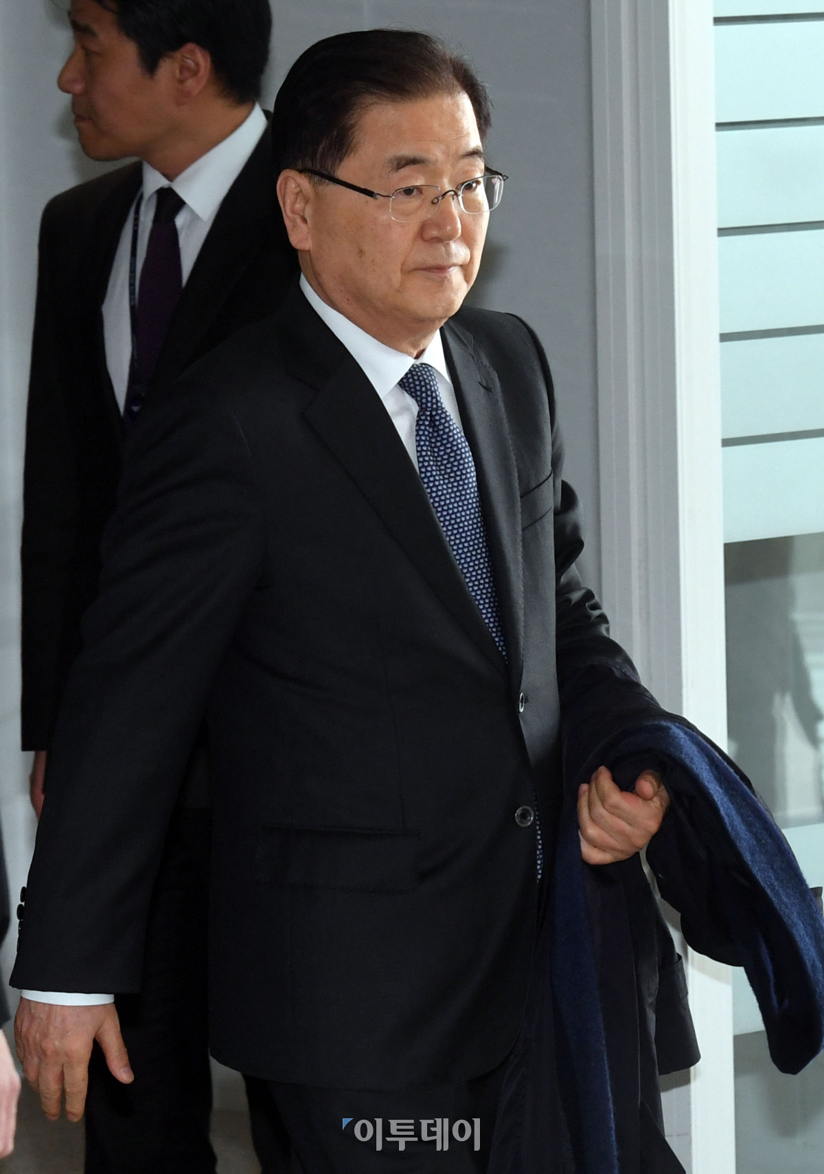 트럼프 대통령에게 방북 결과를 설명하는 등 미국 방문을 마친 정의용 국가안보실장이 11일 인천국제공항을 통해 귀국하고 있다. 이동근 기자 foto@