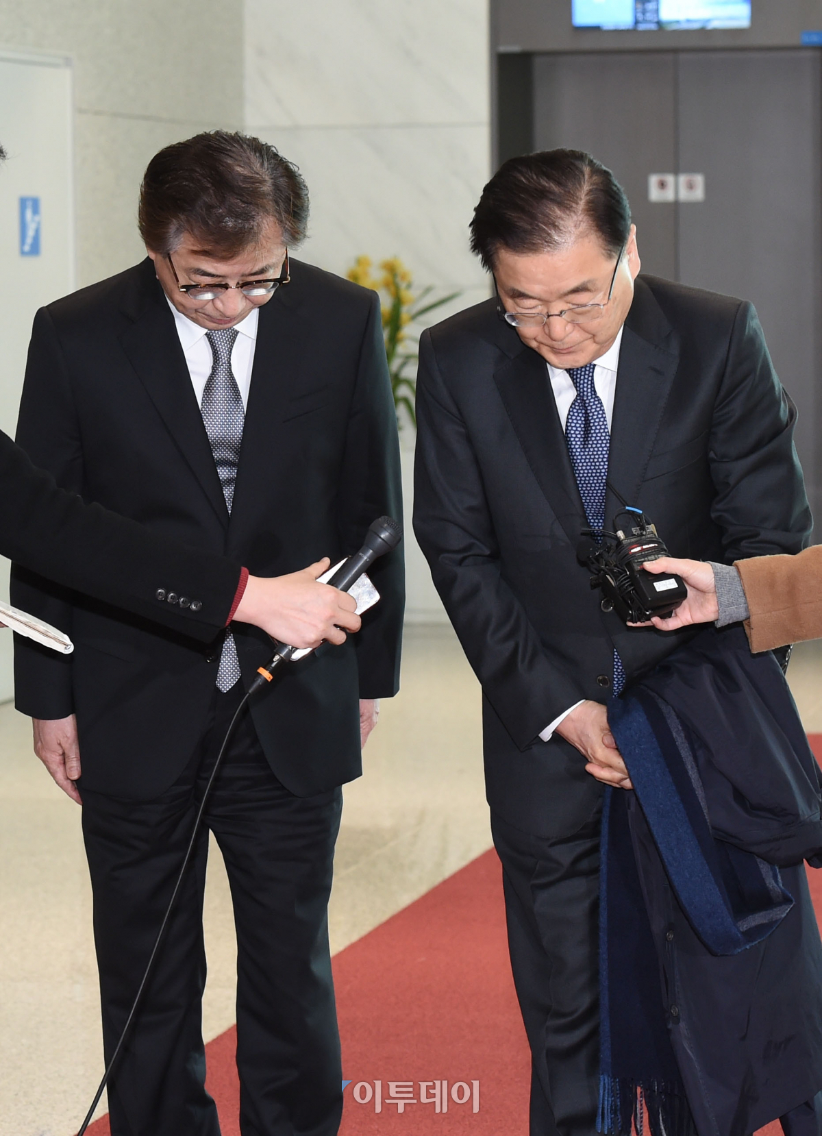 트럼프 대통령에게 방북 결과를 설명하는 등 미국 방문을 마친 정의용(오른쪽) 국가안보실장과 서훈 국정원장이 11일 인천국제공항을 통해 귀국하며 고개숙여 인사하고 있다. 이동근 기자 foto@