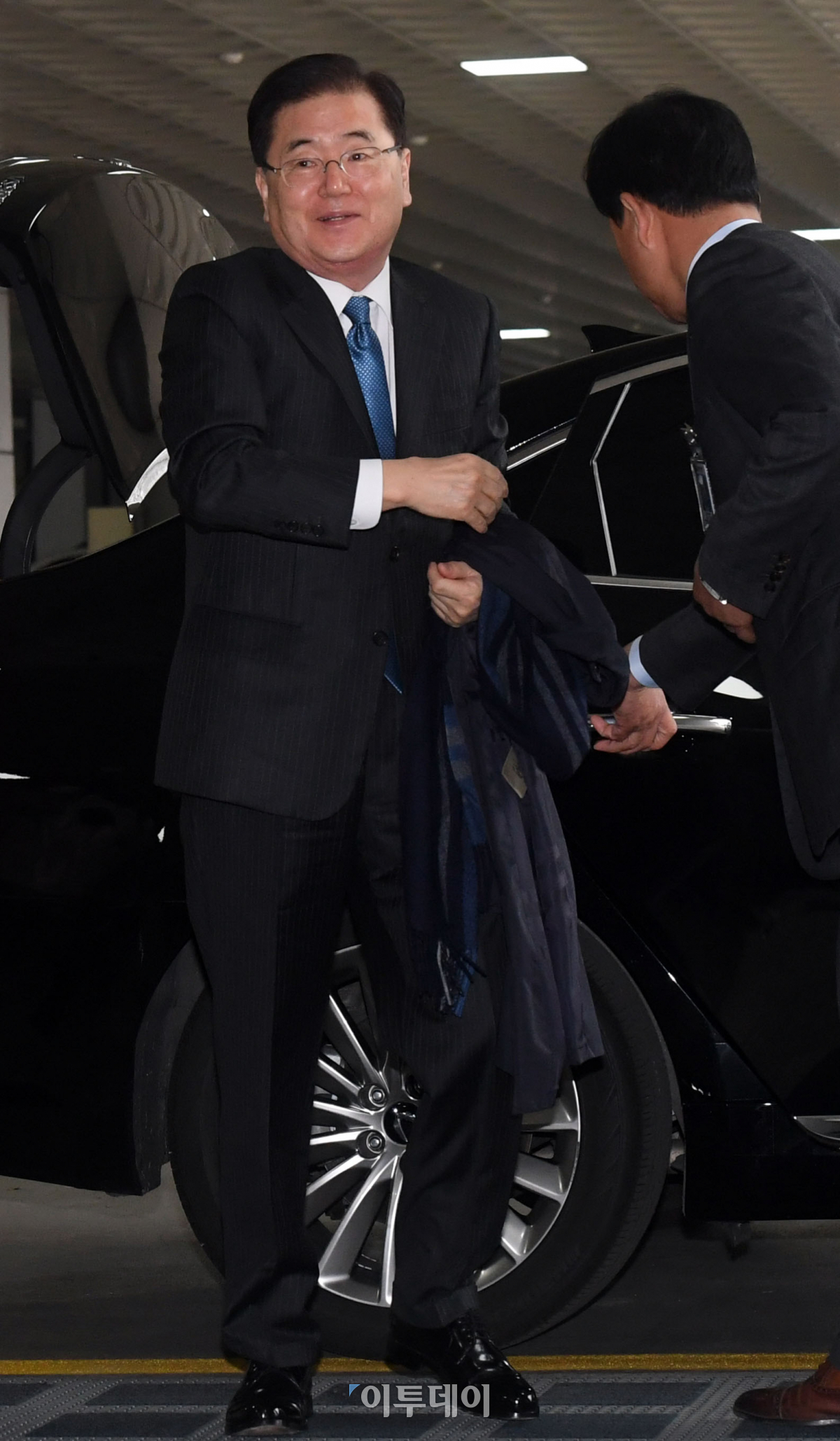 정의용 국가안보실장이 12일 오전 김포공항을 통해 1박 2일간의 일정으로 중국 출국길에 오르고 있다. 정 실장은 대북특별사절단의 북한 방문과 미국 방문성과를 설명하고 협조를 요청하기 위해 이날 오후 시진핑 주석을 접견할 예정이며, 곧바로 러시아로 향해 이틀가량 머물 예정이다. 이동근 기자 foto@