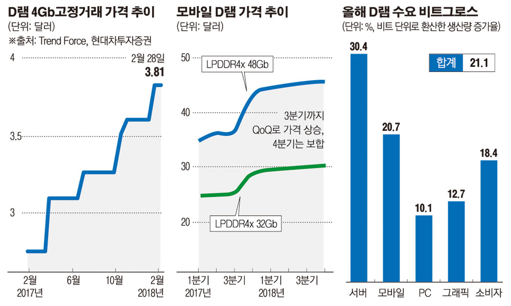 이 보고서가 나온 뒤 미국 최대 메모리 반도체 생산업체인 마이크론테크놀러지는 주가가 사흘 만에 10% 넘게 올랐다. 대만의 IT전문 매체인 디지타임스는 지난 7일 업계 소식통을 인용, “올해 데이터센터, 스마트폰용 수요 급증에 힘입어 전세계 D램 시장 매출이 960억달러에 달하면서 작년보다 30% 이상 늘어날 것”이라고 보도했다.