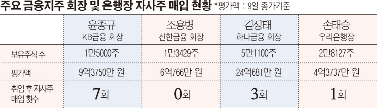 앞서 윤종규 KB금융지주 회장은 지난달 13일 KB금융 주식 1000주를 장내 매수했다.