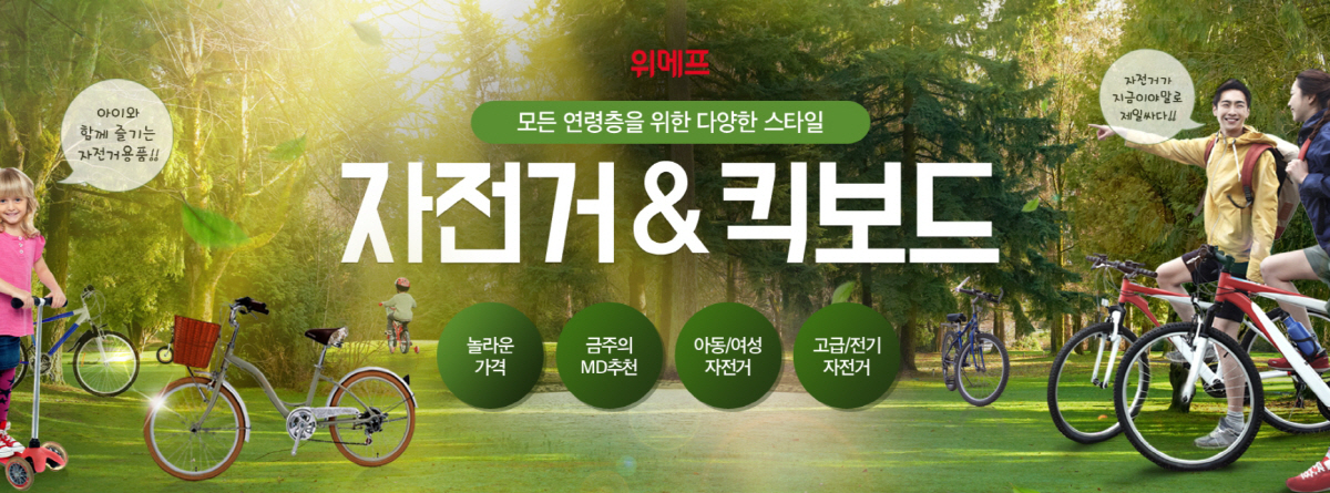 위메프는 모든 연령층을 위한 다양한 스타일의 자전거와 킥보드를 선보이는 특가 기획전을 진행하고 있다. 성인용으로 인기가 높은 하이브리드와 미니벨로, MTB 자전거부터 아동용 자전거와 전기 자전거까지 다양한 품목들이 준비돼 있다. 위메프에 따르면 3월 첫째 주 기준 자전거 매출은 전주 대비 24.2% 올랐다. 킥보드는 79.8% 증가했고 스케이트보드는 무려 102.5%의 신장률을 보였다. 위메프 관계자는 “최근 따뜻해진 날씨로 주말 등을 이용해 근교 여행이나 공원, 한강 등을 찾는 사람들이 나들이용 물품을 많이 찾고 있다”고 말했다.