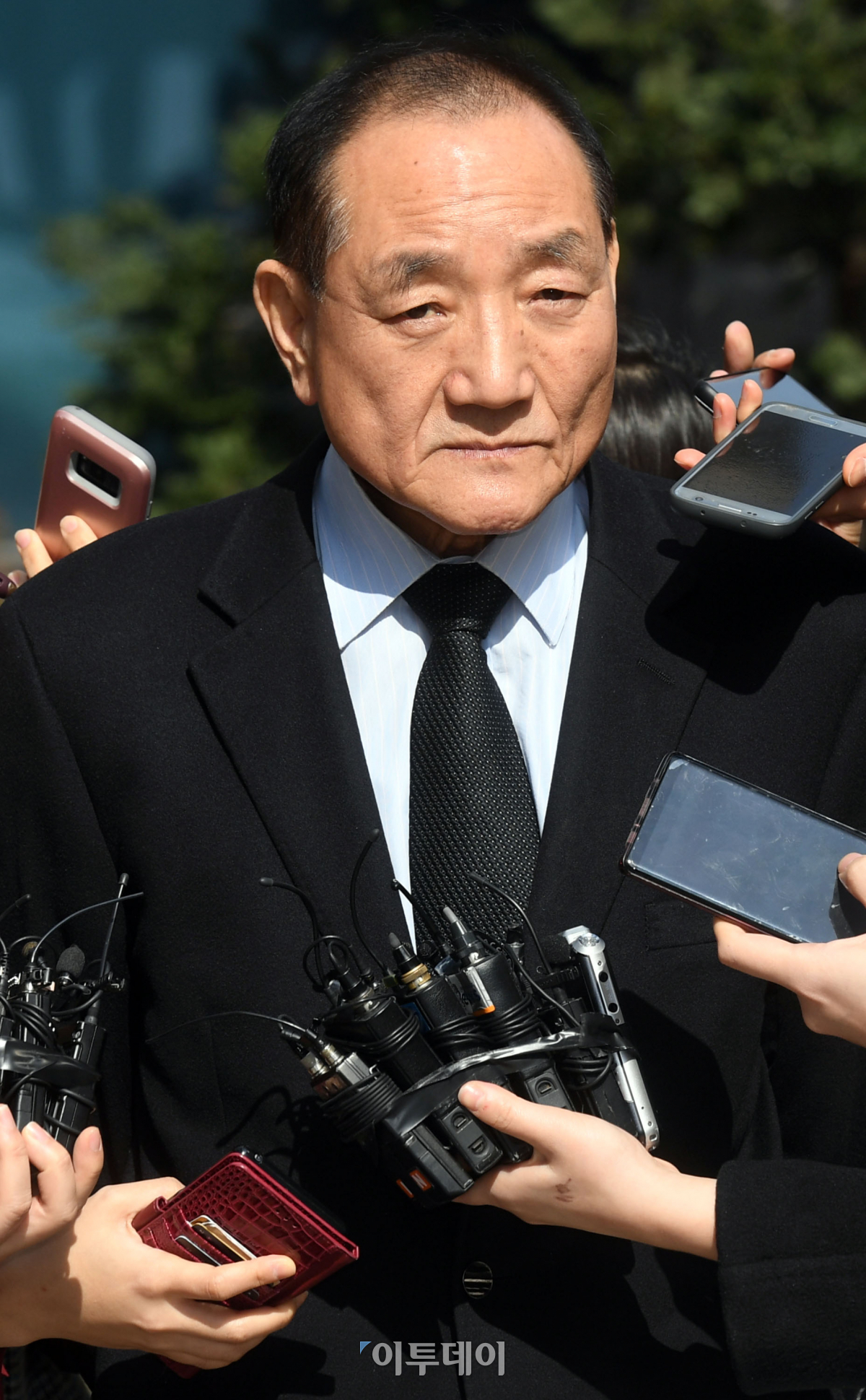 이명박 전 대통령 검찰 소환을 하루 앞둔 13일 서울 강남구 이 전 대통령 사무실 앞에서 김효재 전 정무수석이 소환 관련 언론 브리핑을 하고 있다. 이동근 기자 foto@