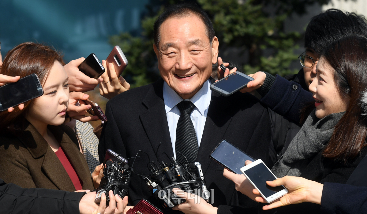 이명박 전 대통령 검찰 소환을 하루 앞둔 13일 서울 강남구 이 전 대통령 사무실 앞에서 김효재 전 정무수석이 소환 관련 언론 브리핑을 하고 있다. 이동근 기자 foto@