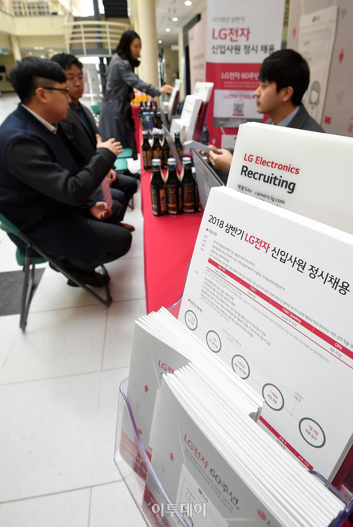 올해 상반기 대기업 공개채용 시즌이 시작된 가운데 13일 오전 서울 관악구 서울대 공대 로비에 LG전자가 신입사원 정시채용 상담부스를 운영하고 있다. LG전자, LG디스플레이, LG화학 등 LG그룹은 올해 1만 명의 인력을 신규 채용하겠다고 밝혔다. 이동근 기자 foto@