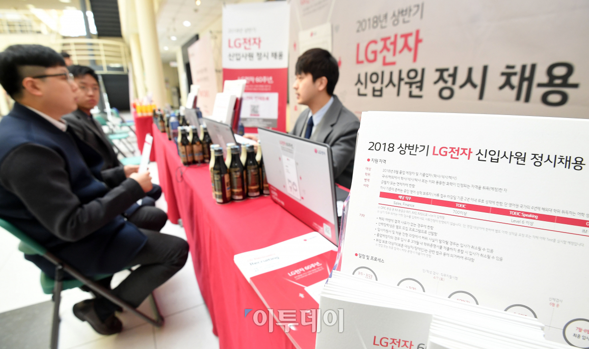 올해 상반기 대기업 공개채용 시즌이 시작된 가운데 13일 오전 서울 관악구 서울대 공대 로비에 LG전자가 신입사원 정시채용 상담부스를 운영하고 있다. LG전자, LG디스플레이, LG화학 등 LG그룹은 올해 1만 명의 인력을 신규 채용하겠다고 밝혔다. 이동근 기자 foto@